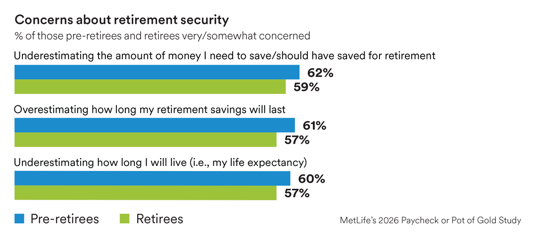 According to MetLife’s research, pre-retirees and retirees fear they may not have properly planned for the sustainability of their retirement funds, and they are concerned about their retirement security.1