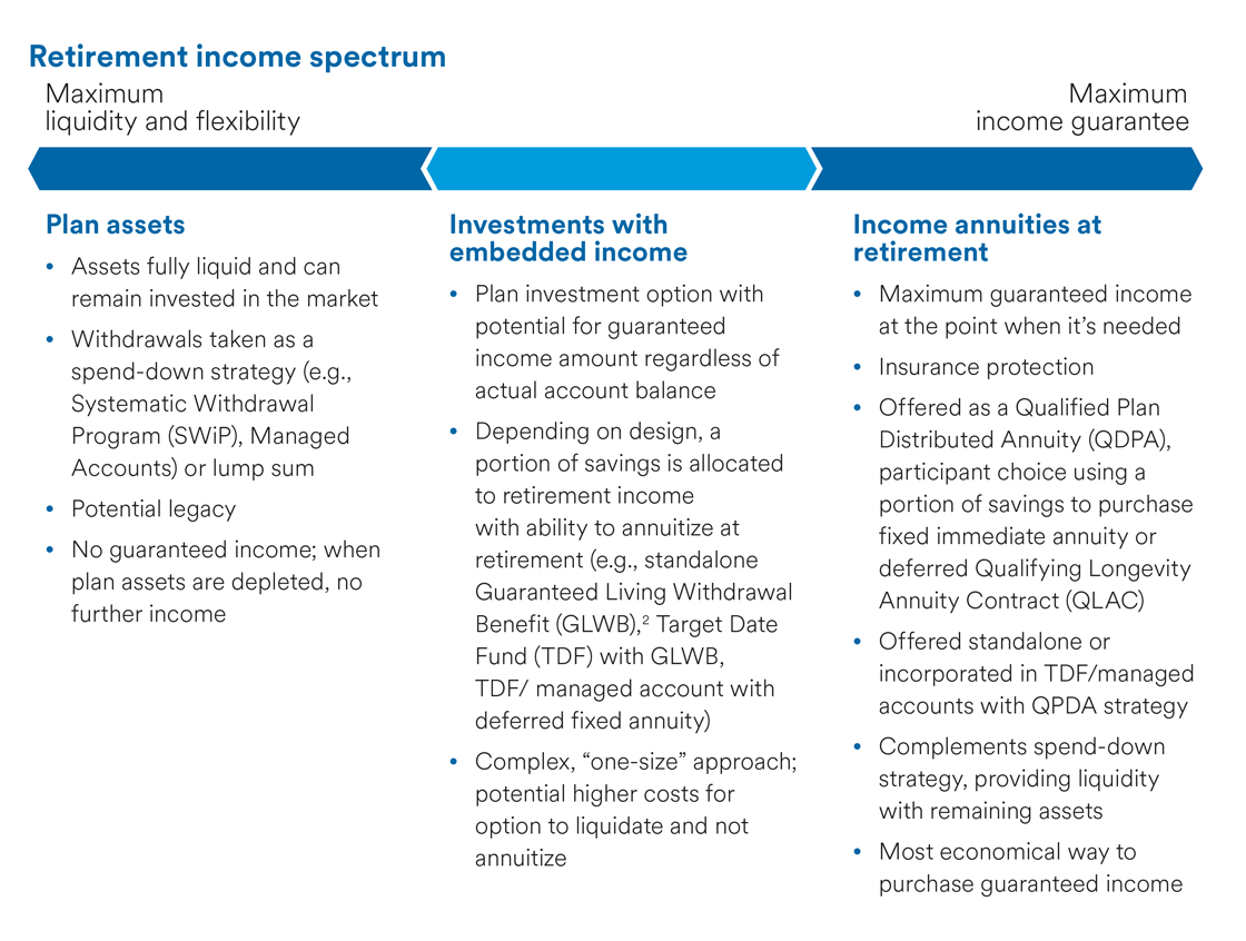 One area of experimentation, first in retail and more recently in the institutional retirement arena, is a product category that we refer to as investments with embedded income. These are plan investment options for participants contributing during their working years, which have the potential for guaranteed income. Often offered as a Qualified Default Investment Alternative (QDIA), these options tend to be complex. Depending on design, a portion of savings is allocated to retirement income with the ability to annuitize at retirement (e.g., standalone Guaranteed Living Withdrawal Benefit (GLWB), Target Date Fund (TDF) with GLWB, TDF/managed account with deferred fixed annuity). However, if the participant decides not to avail themselves of guaranteed income, they presumably are paying potentially higher costs for the option to liquidate. Rather than being tailored to the needs at the plan participant at the point of retirement, investments with embedded income take a “one-size-fits-most” approach.